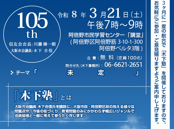 | 第64回 | H26.09.13 (土) 19時 | 都構想「新・南区のマニフェスト公表」 ~どうなる阿倍野の将来~ |